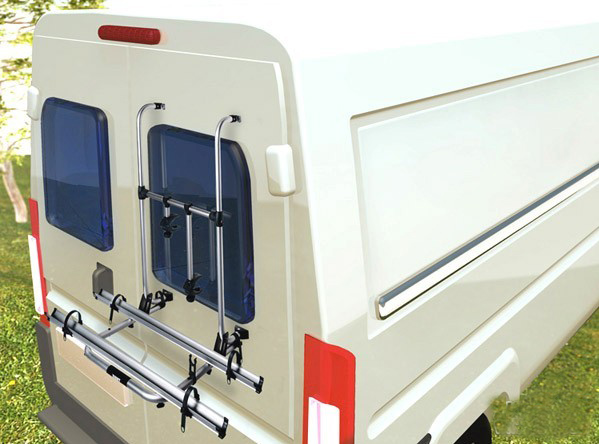 自行式房車一般只能裝到后面,值得注意的是車身后面的安裝位置是否會與其它裝備有所干涉。通常出于安全考慮,自行車架都是裝到后側(cè)中間位置,如果后側(cè)有左右門或爬梯,那么只能選擇在右側(cè)安裝的自行車架,如果后側(cè)無門也無爬梯,那么要考慮后側(cè)是否有窗戶,若沒有窗戶,則可以選擇安裝桿較長的自行車架。