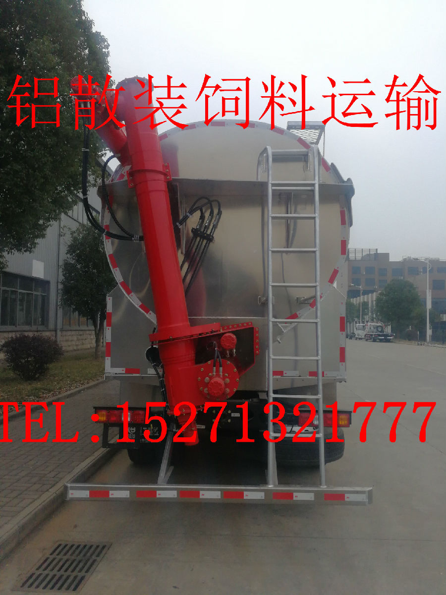 散裝飼料車的飼料罐架設在卡車的底盤上,罐頂開有進料口.頂部的一根螺旋輸送卸料管(俗稱卸料絞龍)則可自由回轉和抬升,抬升的仰角可達60度。運輸時,頂部的螺旋管平臥在罐頂;卸料時則抬起,使管端的出料口與畜禽飼養(yǎng)場貯料罐頂部的進料門相接,駕駛室內(nèi)裝有操縱裝置(操縱裝置也可裝置在罐體尾部),卸料時通過車底的動力輸出軸和減速器來驅動螺旋,以完成卸料。目前國內(nèi)主要推出3T、5T、8T、11T、15T和22T等多個噸位車型。